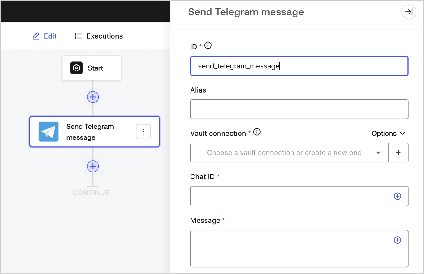 To configure a Vault connection for your Telegram actions, you will need a Token: