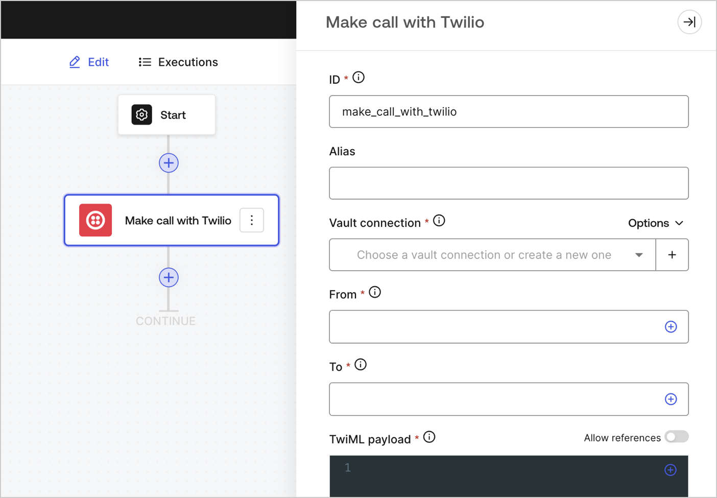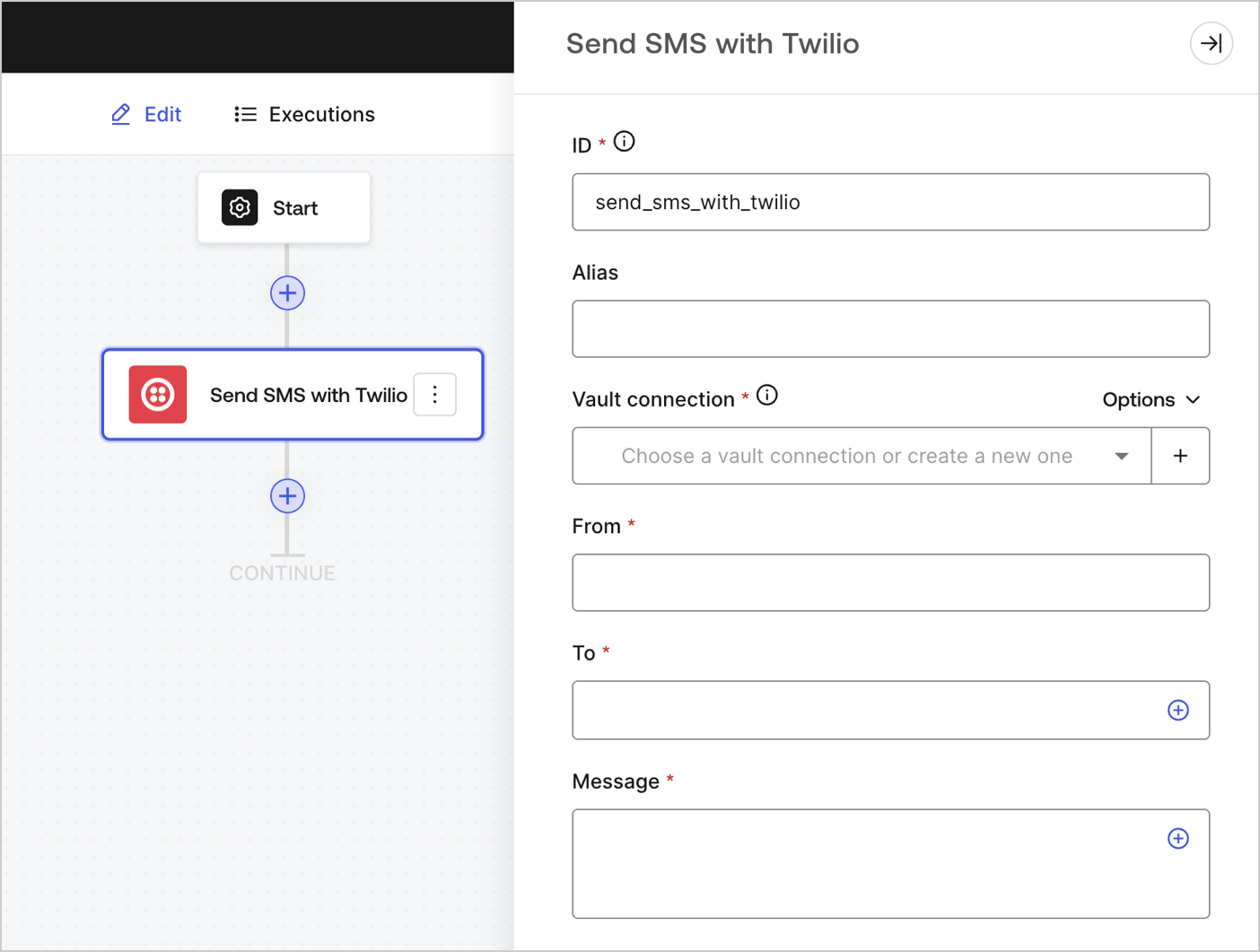 Dashboard > Actions > Forms > Flows > actions > Twilio