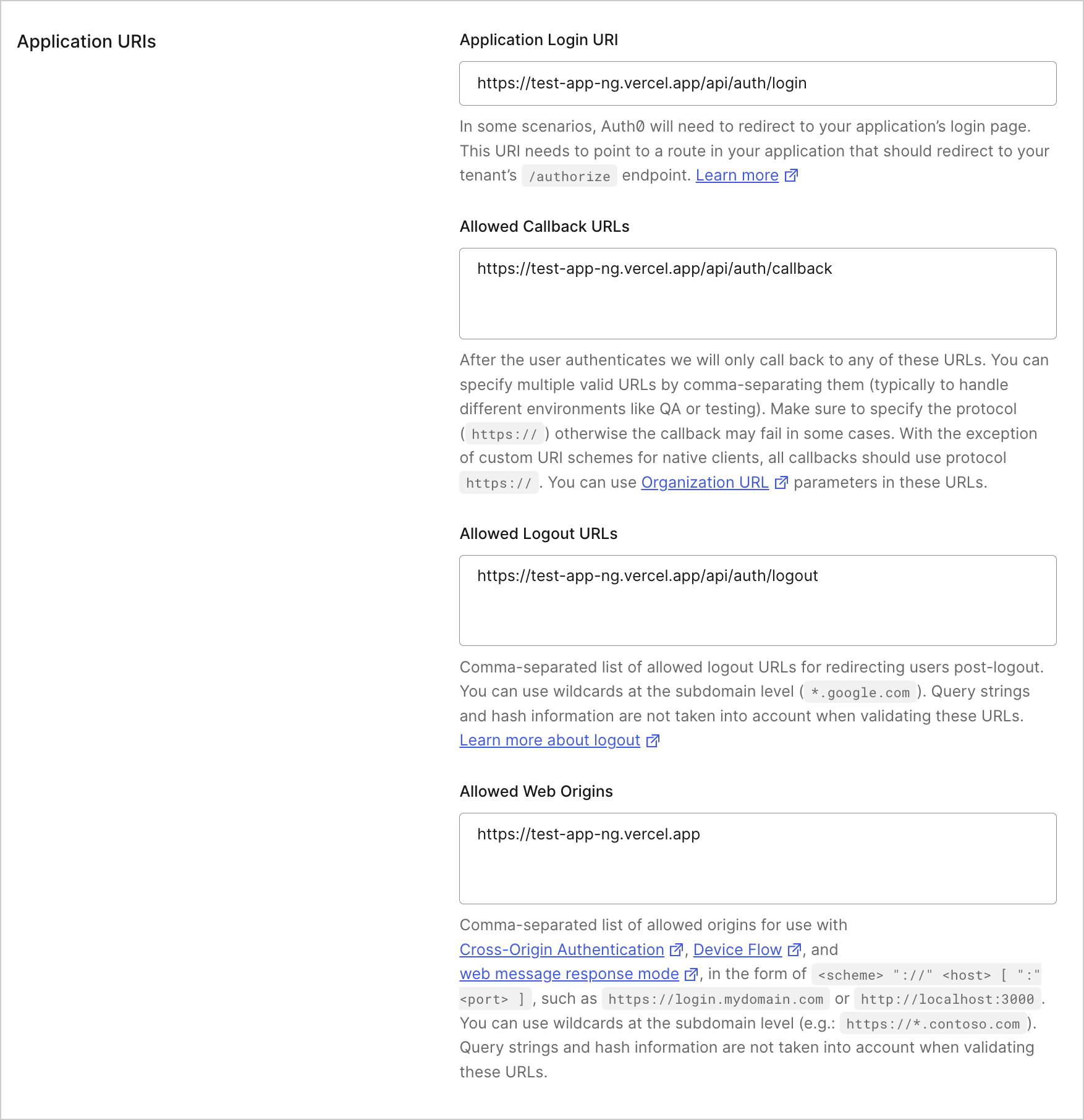 3. Confirm the Vercel application URI under Settings > Application URIs.