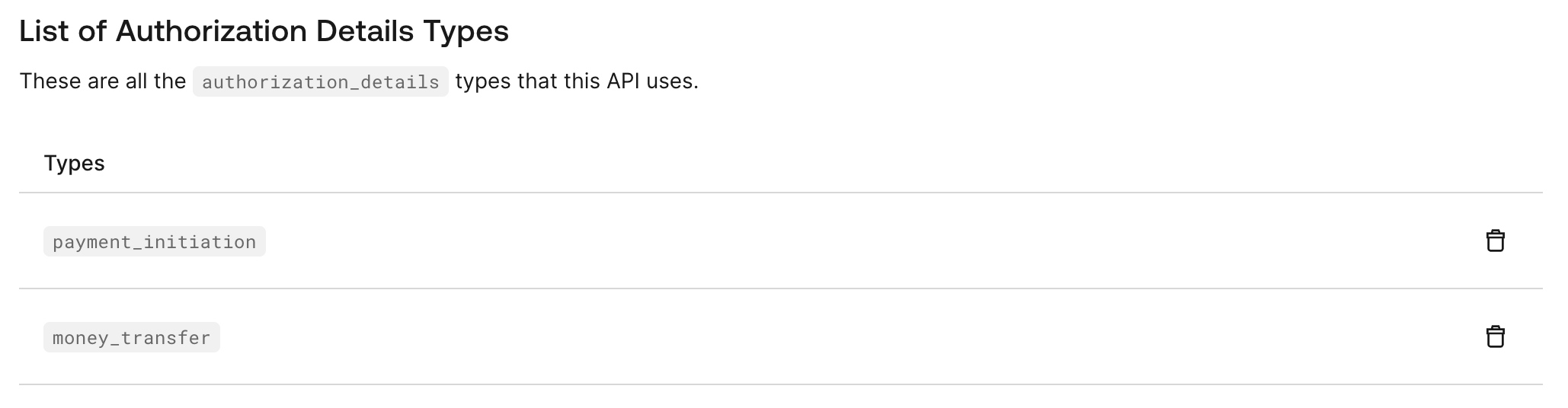 Thetype field determines the customizable object fields. An authorization_details array may contain multiple entries of the same type.