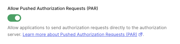 - In the Authorization Requests section, enable the toggle Require Pushed Authorization Requests (PAR).