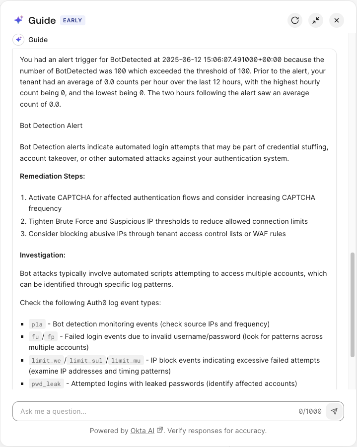 Guide processes your message to determine what you’re asking for, searches Auth0 sources for relevant information, then generates a summarized response based on what it found along with links to the referenced materials. You can ask follow-up questions, validate its responses using the provided links, and give feedback on Guide by rating its responses. For Enterprise subscription customers: If you configure security monitoring alerts in Security Center, Guide helps you troubleshoot incidents and suggests security guidance from a relevant incident playbook. For example, as shown in the following screenshot, when a significant bot surge triggers your alert, Guide recommends remediation steps from the Bot Detection Attack playbook, such as activating CAPTCHA for affected authentication flows, and prompts you to inspect relevant events in the tenant logs.
