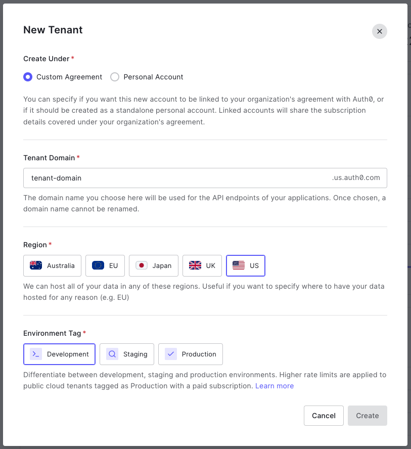 Enterprise subscription automatically allows for users to link tenants under an existing Auth0 subscription by selection “Custom Agreement” option from Create Under when creating new tenants.