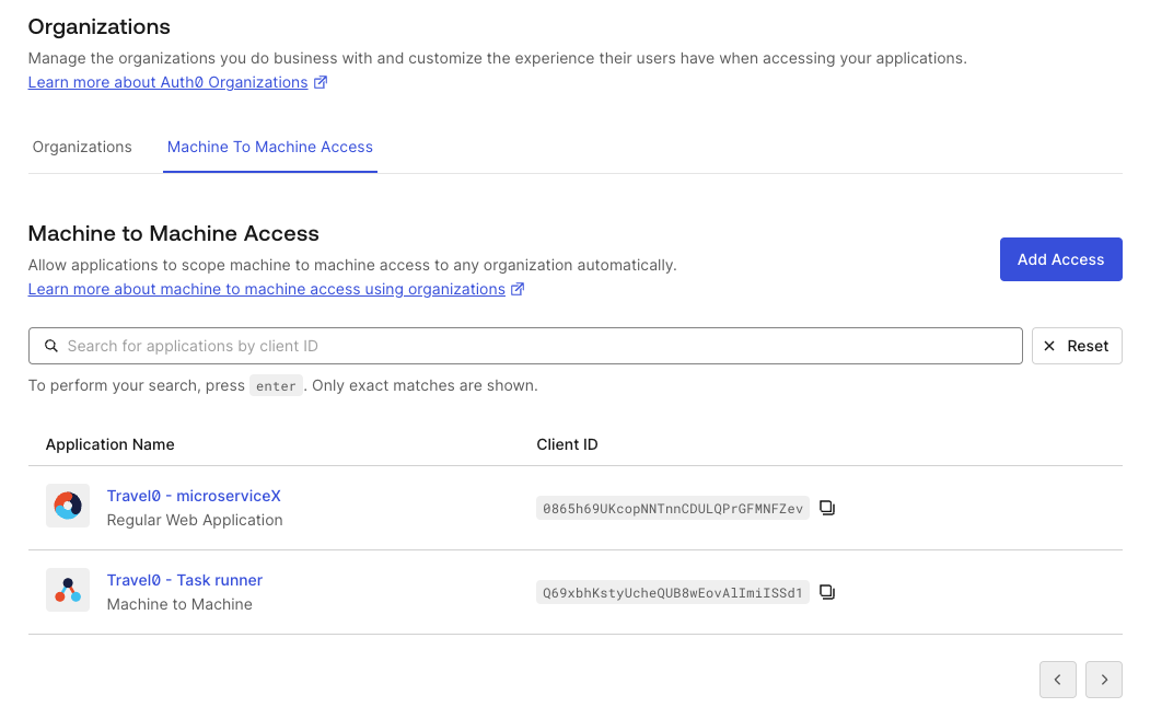 - Select the Machine-to-Machine Access tab. You will get a paginated list of all the applications that can access an API for this organization via direct association.