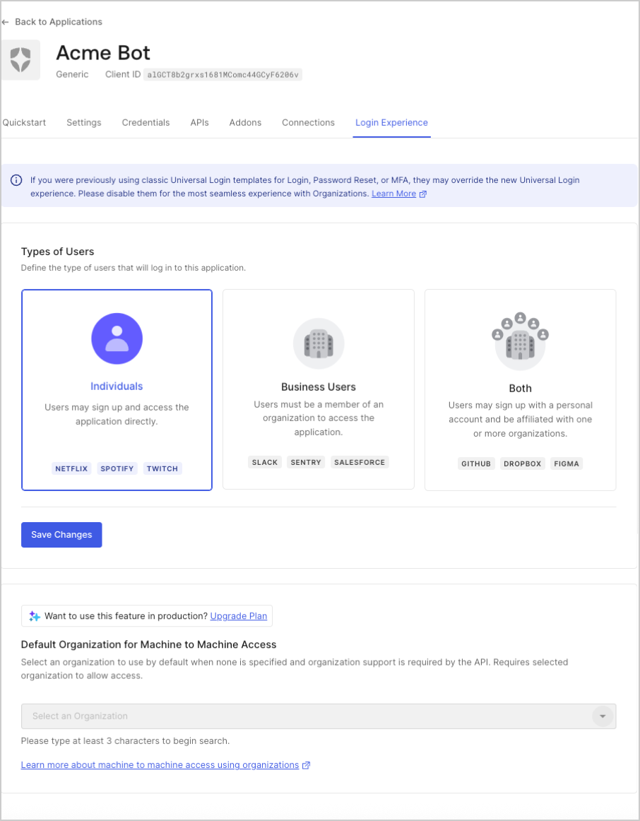 | Default Organization for Machine-to-Machine Access | Defines which organization to apply to Client Credentials requests that do not contain an organization | Default Organization for Machine-to-Machine Access maps to the default_organization object with the following properties: