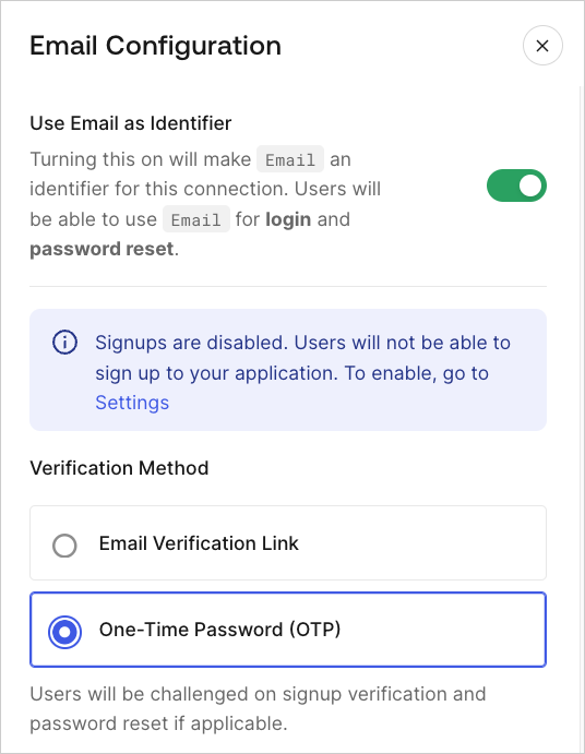 To set up OTPs, go to Authentication > Database and select the connection to change, then pick Attributes, locate Email, choose the menu button,and enable One-Time Password (OTP).