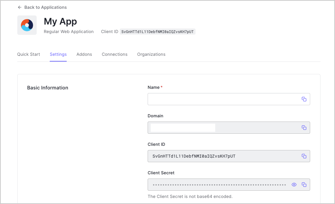 will need some details about that application to communicate with Auth0. You can get these details from the Application