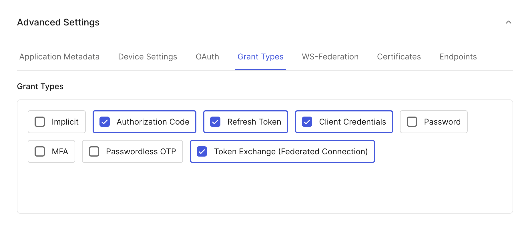 3. Under Advanced Settings > Grant Types, select the Token Exchange (Federated Connection) grant type.