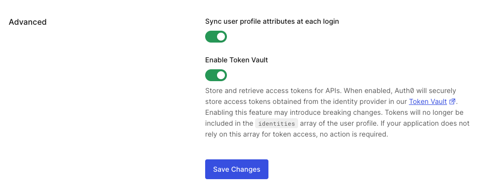 Use the Auth0 Dashboard or Management API to configure a federated connection to retrieve and store access tokens for third-party APIs in the Token Vault. Once you enable Token Vault for your connection, access and will no longer be stored in the user’s identities array. Instead, they will be stored in a secure tokenset within the Token Vault. To learn more, read Manage tokensets.
